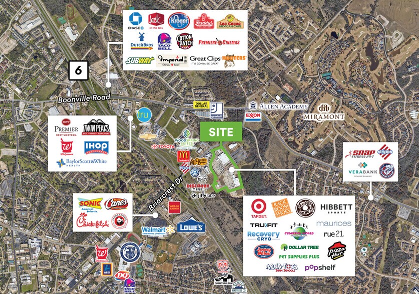 - Le premier centre électrique régional de Bryan, l'ombre Anchored by Target - Zone aisée et en croissance rapide, avec un revenu médian d'environ 85 000 $/an et un taux de croissance de 6 % - Accès facile et excellente visibilité à partir de l'autoroute North Earl Rudder (~65 000 VPD) et de la promenade Briarcrest (~22 000 VPD) - La gamme de locataires attrayante comprend Target, TruFit, Hibbett Sports, Rack Room Shoes, Aqua Tots et PopShelf avec plus de 4 000 000 visites annuelles au cours des 12 derniers mois - 112 chambres Hôtel Hyatt House - Proximité de l'Université Texas A&M (74 829 inscriptions à l'automne 2022), du Texas A&M Health Science Center et du Blinn College