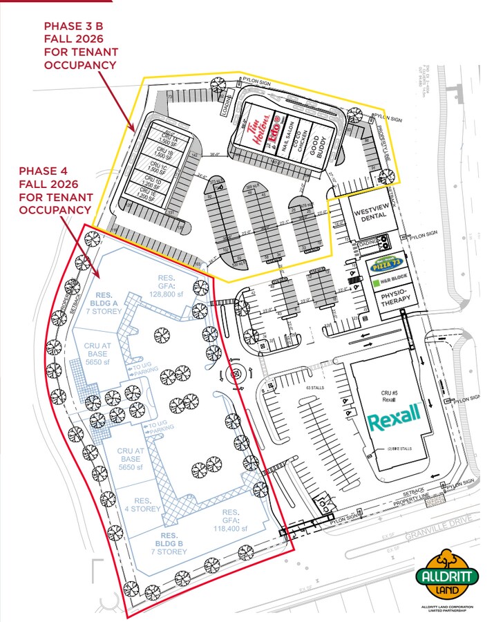 • Situé à l'intersection principale desservant les quartiers Lewis Estates et The Grange avec un débit de circulation de plus de 22 700 véhicules par jour sur Whitemud Drive et 19 000 véhicules par jour sur le chemin Guardian • À proximité du périphérique Anthony Henday Drive • La population de la zone commerciale immédiate, Lewis Estates et The Grange (y compris Granville), devrait passer à 66 666 une fois entièrement construite • Proximité du River Cree Casino (Hôtel Marriott - 255 chambres, jeux, patinoires de hockey) • Un développement unique avec un mélange de détail et multifamilial haute densité • Les tirages au détail dans la région immédiate comprennent Costco, Rexall, Safeway, Banque TD, Banque Scotia, ATB et Tim Hortons • Architecture d'artisan accrocheur • Possibilités d'emplacement des caractéristiques de l'eau