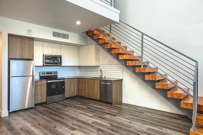 - Modern loft style units featuring spacious open layouts, quartz countertops, stainless steel appliances, central heat/air, and in unit washer/dryer
