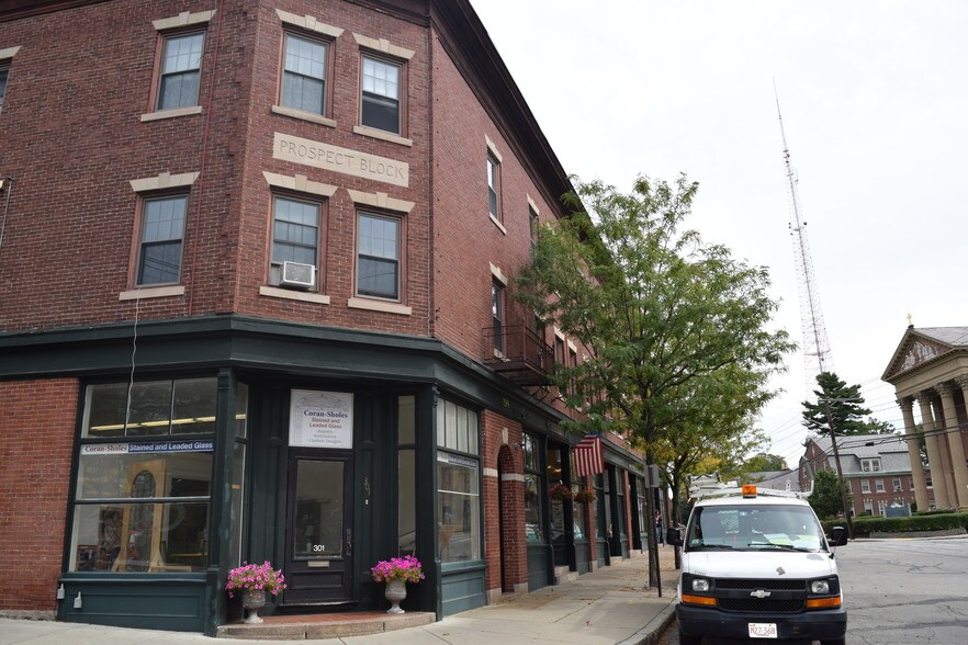 Édifice à usages mixtes de Newton Upper Falls avec de hauts plafonds et de grands droits de signalisation sur l'édifice