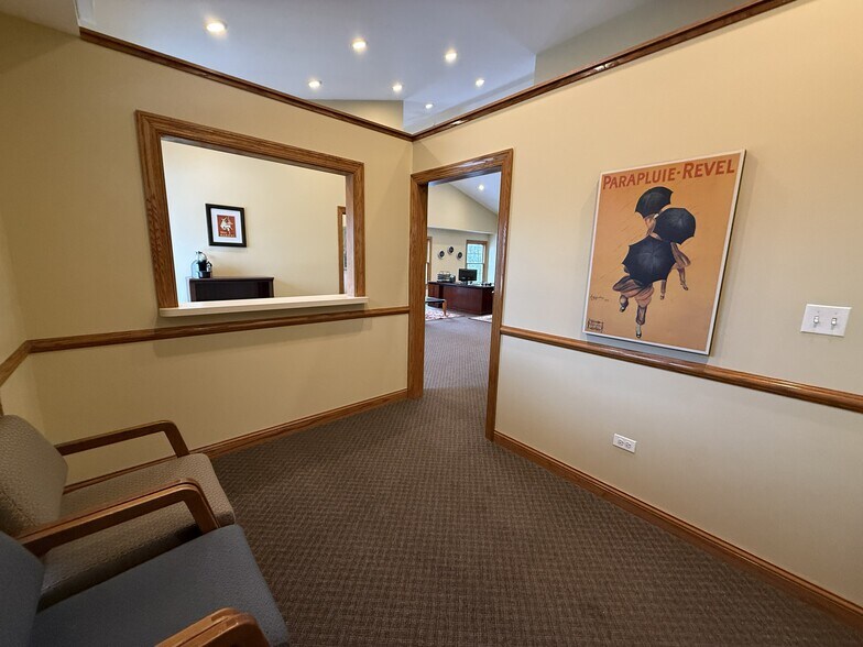 Exceptional 1,400 SF main-floor professional office suite available in a well-maintained all-brick building with private parking and strong corporate image. This ADA-accessible, upscale professional office features a corporate-style interior with reception/waiting area, private office, an impressive glass-lined conference room, and an expansive open work area with soaring vaulted ceilings, recessed lighting, and outstanding natural light. Approximately 10 large windows provide beautiful wooded views and rare privacy with no close neighboring buildings. The suite also offers a kitchenette, private restroom, utility sink, and an efficient layout ideal for attorney / law firm, legal office, CPA / accounting office, tax preparation, wealth management, financial advisor, insurance agency, consulting office, real estate office, title company, mortgage broker, business office, executive office, boutique corporate office, therapist office, counseling office, psychologist, psychiatry, speech therapy, occupational therapy, chiropractic, physical therapy consult office, medical specialist office, wellness practice, nutrition / diet center, med spa consult office, skin care office, staffing agency, travel agency, marketing agency, computer / IT consulting, design studio, architecture office, engineering office, bookkeeping, payroll service, and other business services. Shared foyer with established dental office creates a professional image for client-facing business, while the layout offers private offices / reception potential in a boutique office environment. This move-in ready office suite is excellent for law, finance, consulting, counseling, or medical office use and is ideal for quiet professional practice. Conveniently located near Peterson Road/Route 137 between Route 45/Butterfield and Milwaukee Avenue, with an attractive entrance off Cass Avenue just off Peterson Road.'