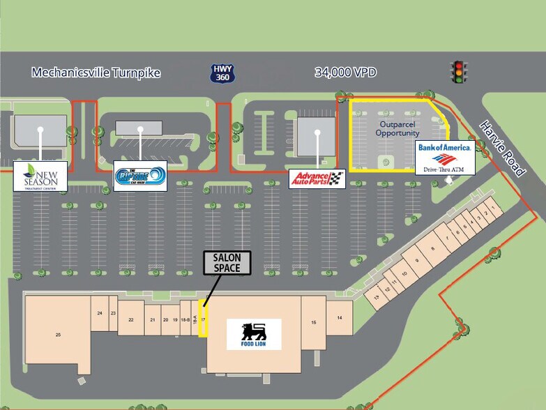 Situé dans un centre commercial de quartier animé ancré par Food Lion, cet établissement offre une excellente visibilité depuis Mechanicsville Turnpike (route 60) et se trouve à proximité de l'I-64. Le centre commercial abrite un mélange diversifié de locataires, dont Rainbow, Doll House, Perfect Place Events et Virginia ABC, créant ainsi un environnement commercial dynamique. Des panneaux de pylône bien en vue sont disponibles pour améliorer la visibilité de votre entreprise. Le centre bénéficie d'un trafic élevé, avec 36 000 véhicules par jour sur Mechanicsville Turnpike et 76 000 véhicules par jour sur l'Interstate 64. La région avoisinante a une forte présence démographique, avec une population de 10 729 habitants dans un rayon d'un mille, 101 019 dans un rayon de trois milles et 232 321 dans un rayon de cinq milles. Le revenu moyen des ménages dans la région est de 62 013$, 63 157$ et 73 043$, respectivement, et la région soutient d'importants emplois de jour avec 2 168 emplois dans un mille, 78 938 dans un rayon de trois milles et 213 833 à moins de cinq milles.