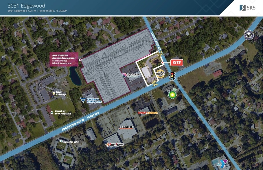 Points d'entrée et de sortie pratiques depuis Edgewood Avenue et Cleveland Road. Projet de 88 maisons en rangée par Forestar Group, Francis Pointe, en cours de développement derrière le site.