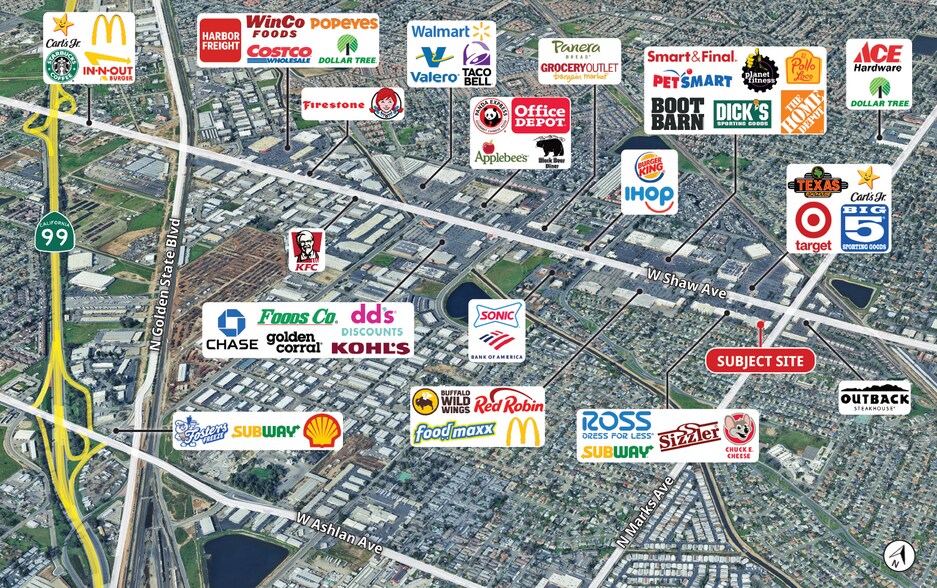 • Reciprocal parking access • Corner lot located on W Shaw Ave & N Marks Ave • Nearby retailers include; Ross, Food Maxx, Boot Barn, Big 5, Target, The Home Depot, Pet Smart, Dick's Sporting Goods, Smart & Final