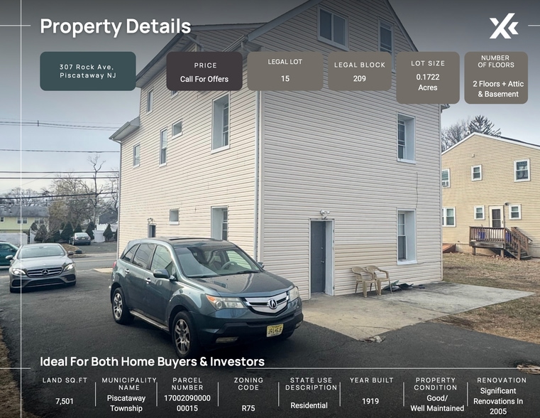 This sale opportunity is a Two (2) family home situated on Rock Avenue in Piscataway NJ. This property features two (2 BR/1Bath) units, a garage, backyard and attic. The first floor is currently rented at $2,495 per month. The second floor is currently vacant and is “move in” ready for potential home buyers. This asset offers several value-add opportunities. The garage is available to be rented for additional income (previously rented for $650 per month). The attic is also a potential value-add asset by converting it into more living space for the second-floor unit. The attic currently has its own separate entrance and is not connected with the second-floor unit at this time. There is potential to convert the second-floor unit into a 3BR/2Bath with the addition of the attic space.