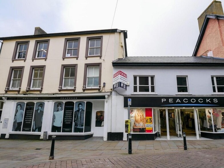 The building is of masonry construction under a slate roof, with a large display retail frontage below a rendered upper floor elevation. The middle section of the building has a flat roof over the ground floor.