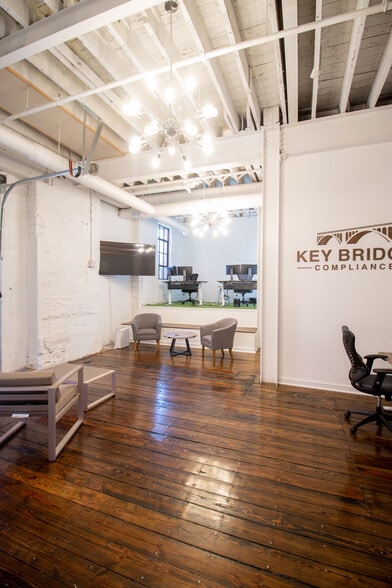 Warehouse-style office space in the heart of Covington's Pike Street Corridor. Historic features include original hardwood floors, exposed ceilings and brick walls. Remnants of the old freight elevator bring an industrial sense to the unique space. Shared, secure entry is tucked behind Pike Street on Innovation Alley. 2 Private Offices 1 Conference Room Open Work Space Lobby Kitchenette 2 Bathrooms Mother's Room Overhead Door