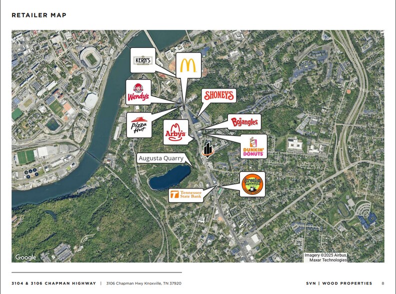 Situé juste au sud du centre-ville de Knoxville, dans les développements riverains en pleine expansion le long du corridor très fréquenté de Chapman Highway, cette propriété offre une visibilité exceptionnelle et des opportunités de signalisation. Le terrain est zoné C-G-2, ce qui permet de nombreuses utilisations commerciales et de détail. Le trafic quotidien dépasse les 30 000 véhicules par jour (VPD). Avec des restaurants à proximité et des locataires nationaux, cela renforce sa valeur et son potentiel d'attraction.