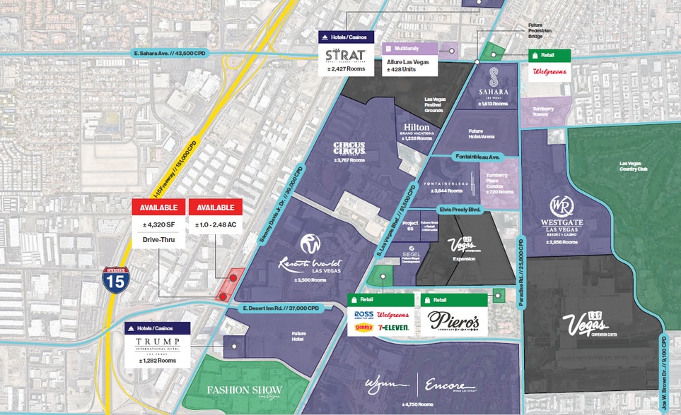 • Prime Resorts Corridor Redevelopment Site: ±1.0–2.48 AC redevelopment opportunity suitable for large-format retail, QSR, or mixed-use development in a high-growth Strip-adjacent corridor. • Prime Resorts Corridor Location: Situated directly behind Resorts World Hotel & Casino, offering immediate proximity to major Strip resorts while avoiding reliance on Las Vegas Boulevard frontage. • High-Volume Parallel Strip Access: Sammy Davis Jr. Drive functions as a primary north–south artery running parallel to the Strip, carrying approximately ±39,000 vehicles per day and serving back-of-house access for multiple resort properties. • Severely Underserved Fuel, Convenience & QSR Market: Despite dense hotel, employee, and visitor activity, the immediate corridor lacks nearby gas stations and limited quick-service restaurant options, creating a rare opportunity to serve 24-hour resort operations, late-night visitor flow, rideshare drivers, and continuous service traffic. • Dense Visitor & Employment Base: The surrounding Resorts Corridor supports approximately 6 million annual attendees and a strong daytime population driven by resorts, convention activity, and entertainment venues. • Strategic Connectivity & Access: Immediate access to I-15 (±236,000 VPD) and key east–west arterials including Sahara Avenue, Desert Inn Road, and Spring Mountain Road, enabling efficient circulation for tourists, locals, and commercial traffic. • Surrounded by Major Ongoing Development: Adjacent to significant current and planned investment, including Resorts World expansion, Las Vegas Convention Center growth, Fontainebleau, MSG Sphere, and future resort and entertainment developments reinforcing long-term demand.