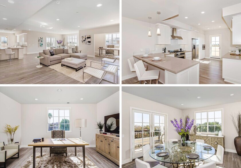The fourth floor consists of two Penthouses, each with two bedrooms, a den/office, two full baths plus a powder room, and dual balconies. The ground floor units each include large private patios. All homes have in-unit washer/dryer closets. The building features 28 side-by-side parking spaces, which includes 3 guest spaces.