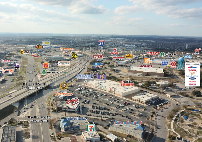 3150 Pat Booker Road is a retail shopping center located at the corner of FM 1604 and Pat Booker Road. Current tenants include Rush Fun Park, SynergenX, Einstein Bros. Bagels, Bubba’s 33, and more. The proprety provides ample parking and easy access to nearby roadways. The 0.74 AC pad site is located along the IH-35 frontage road, and provides prime visibility to the high volume of daily traffic.