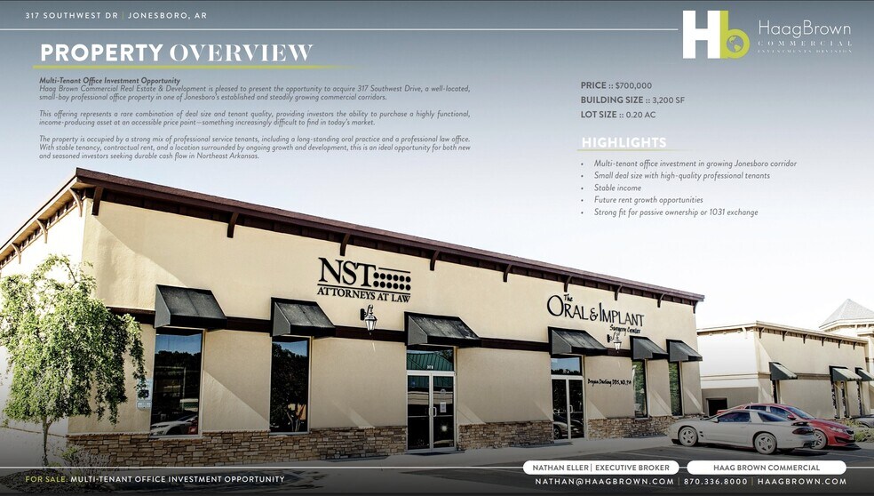Haag Brown Commercial Real Estate & Development is pleased to present the opportunity to acquire 317 Southwest Drive, a well-located, small-bay professional office property in one of Jonesboro's established and steadily growing commercial corridors.