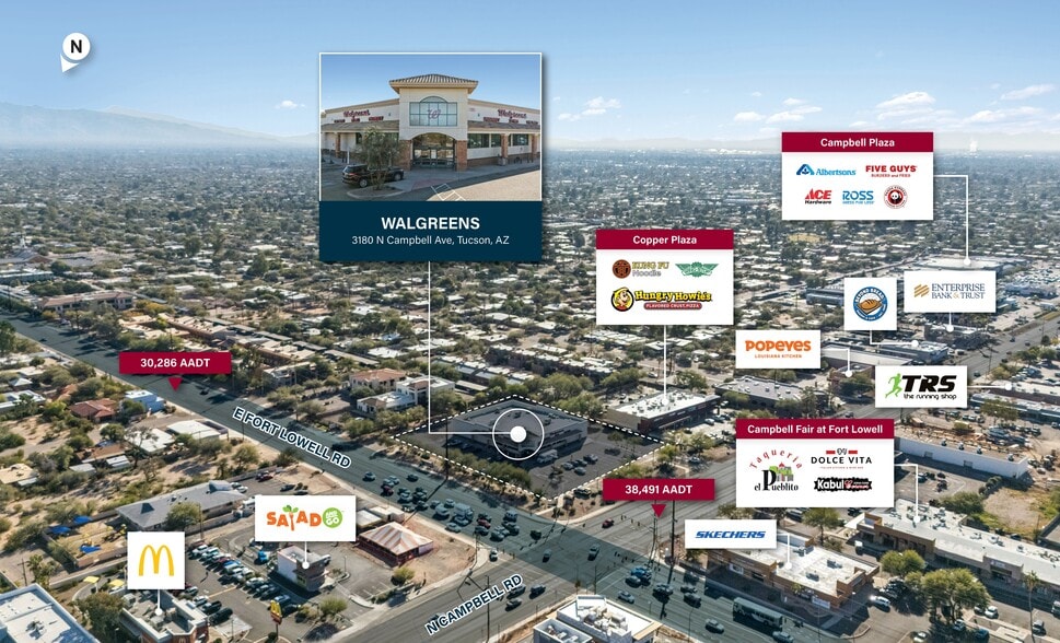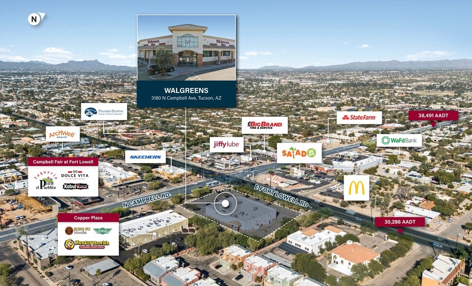 - Prime hard-corner site along N. Campbell Avenue with 38,491 vehicles per day and on-site transit access, maximizing visibility and customer reach.