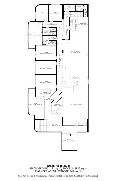 This 4,116-sf office space on the 2nd floor at 320 N Courtland St, features several private offices, restrooms, storage, a waiting room, and a receptionist area.