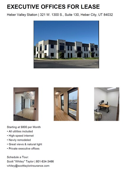 Need a professional office space without the hassle of a long-term lease? Reach out today! Our executive office suites are move-in ready—perfect for entrepreneurs, small businesses, and remote workers who want a quiet, modern space right here in Heber Valley. Starting at $750 per office space. Private offices (furnished or bring your own) High-speed internet & all utilities included Flexible lease terms Free parking 24/7 access Cleaning services included Located in downtown Heber, only 20 minutes from Park City Whether you need a private space to focus, meet clients, or grow your business, this is the perfect spot. Call/text 801-634-3466 or DM me to schedule a tour!