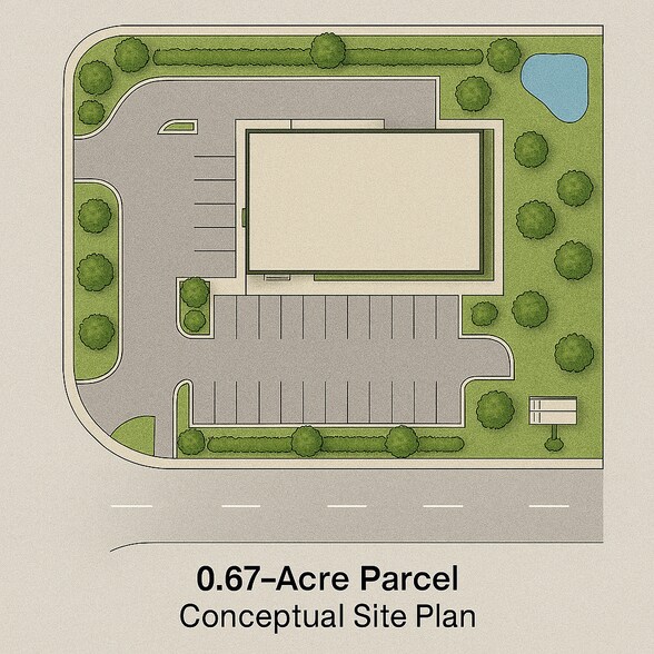 Prime 0.67-acre retail development opportunity featuring a conceptual site plan designed for a ±7,000 SF freestanding building. The layout includes dual access points, 30+ convenient parking spaces, a dedicated delivery zone, and attractive landscaping throughout the site. This parcel offers excellent visibility, efficient traffic flow, and a footprint that fits the needs of national retail users. A strong option for developers or end-users seeking a high-exposure commercial location.