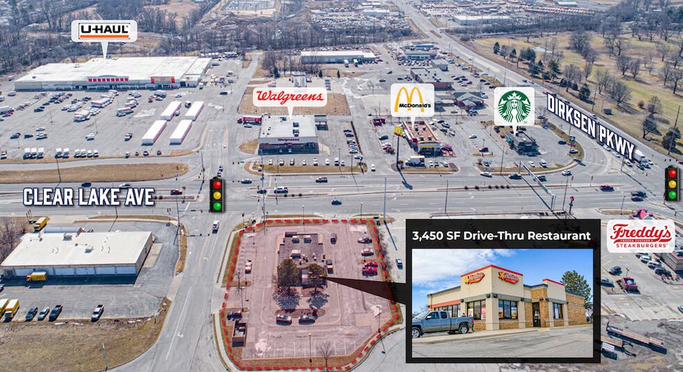 • 3,532 SF drive-thru restaurant building in move-in-ready condition • Situated on a large, 1.3 acre hard corner site fronting Clear Lake Avenue (18,676 VPD) • Signalized intersection just west of a full interchange with Interstate 55 (48,135 VPD) • Strong QSR presence in this corridor including McDonald’s, Starbucks, Freddy’s • Excellent visibility and access at the stoplight intersection with Walgreens • Lots of furniture, fixtures, and equipment remaining in the premises allows for quick remodel and reopening