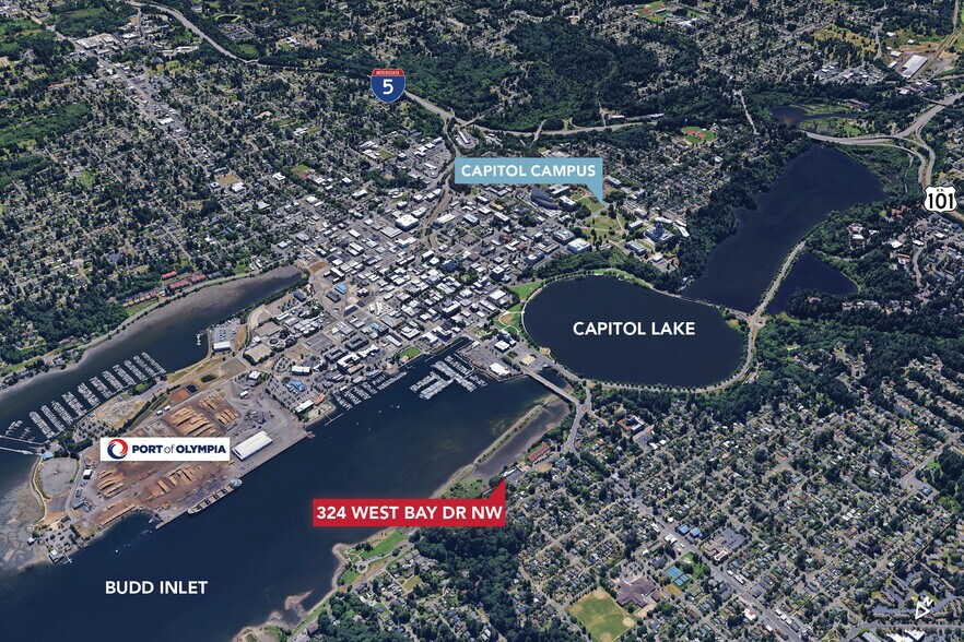 A peaceful waterfront building with off-street parking, shared access to common area kitchen and reception, and stunning views of Budd Inlet and Downtown Olympia. Utilities are included in the base rent; tenants are responsible for phone/data equipment and service, as well as janitorial services.
