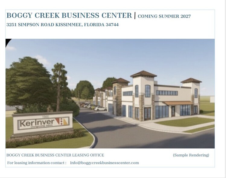 Boggy Creek Business Center Medical & Professional commercial Office Spaces | in Pre- Construction Phase Boggy Creek Business Center is a thoughtfully planned commercial and medical office development located at 3251 Simpson Road, Kissimmee, Florida, directly adjacent to the Lake Nona submarket and minutes from the region’s most prominent medical and residential growth corridors. Positioned along a high visibility roadway with convenient access to SR 417, the project offers exceptional connectivity and exposure within one of Central Florida’s fastest-growing areas. [lakenonasocial.com], [onedrive.live.com] Designed to serve medical, wellness, and professional commercial users, Boggy Creek Business Center will feature build-to-suit commercial spaces in a modern, multi-tenant setting. The project is anchored by Kerinver Chiropractic Health and includes five additional tenant suites, each planned for approximately 1,400 to 1,600 square feet, allowing tenants the flexibility to design spaces aligned with their operational needs. The property is located less than three miles from Lake Nona Medical City, a nationally recognized health and life sciences hub home to leading institutions such as the University of Central Florida College of Medicine, Nemours Children’s Hospital, and the VA Medical Center. This proximity positions Boggy Creek Business Center as an ideal destination for medical practices and professional services seeking access to Lake Nona’s expanding healthcare ecosystem—without the congestion or pricing typical of larger institutional campuses. [onedrive.live.com] Surrounded by significant residential and mixed-use development, the area continues to experience strong population and income growth, supporting long-term demand for neighborhood oriented healthcare and professional services. With substantial daily traffic counts along Simpson Road and immediate access to surrounding communities, Boggy Creek Business Center offers a rare opportunity to establish a presence in a high-growth corridor at the edge of Lake Nona. Boggy Creek Business Center is currently planned for delivery Summer 2027 and is now positioning tenants for early build out and leasing opportunities.