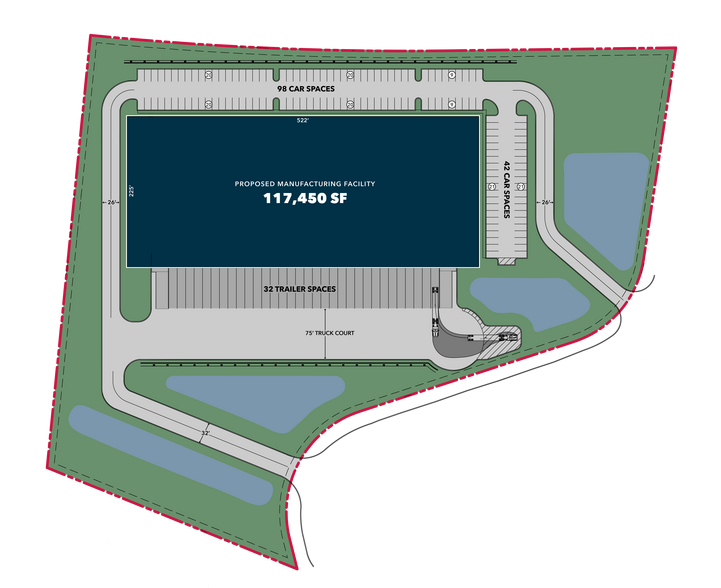 13.4 Acres for Sale, Industrial and Manufacturing. Conceptual Plan: Total Building Size: 117,450 SF Clear Height: Up to 50’ Building Height Permitted Dock Doors: Proposed 26 Drive-in Doors: Two (2) Car Parking: 140 spaces