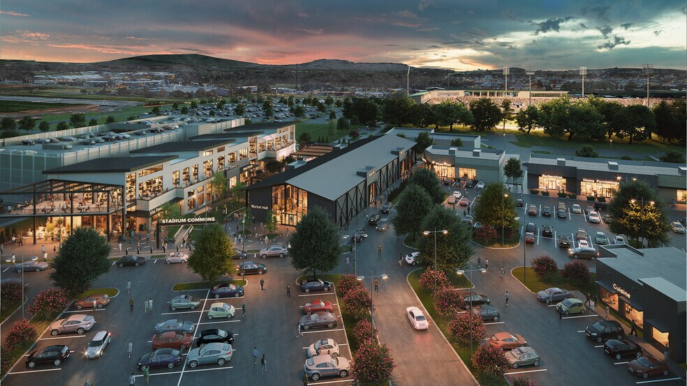 Situé directement à côté de la promenade South Memorial Parkway, à Huntsville, très fréquentée, le Stadium Commons est la première phase d'un futur projet à usages mixtes qui offre des services de vente au détail et des aliments et des boissons, et fait partie d'un plus grand développement comprenant plusieurs familles et un hôtel sur place. Le site est très visible et il y a environ 120 890 véhicules par jour en passant. Il se trouve également à proximité de nombreux quartiers résidentiels et du principal quartier des affaires du centre-ville de Huntsville.