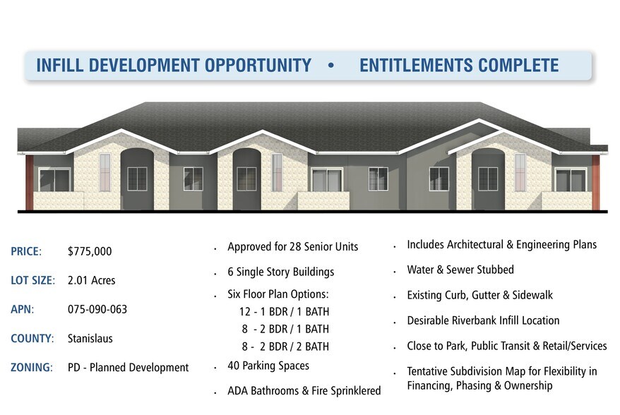 **OPPORTUNITÉ DE DÉVELOPPEMENT EN ZONE URBAINE** • **AUTORISATIONS COMPLÈTES** - **Approbation pour 28 unités pour personnes âgées** - **6 bâtiments de plain-pied** - **Six options de plans d'étage :** - 12 unités : 1 chambre / 1 salle de bain - 8 unités : 2 chambres / 1 salle de bain - 8 unités : 2 chambres / 2 salles de bain - **40 espaces de stationnement** - **Salles de bain conformes aux normes ADA & système de gicleurs anti-incendie** - **Système de gicleurs anti-incendie inclus** - **Plans architecturaux et d'ingénierie inclus** - **Raccordements d'eau et d'égouts déjà en place** - **Bordures, caniveaux et trottoirs existants** - **Emplacement recherché dans une zone urbaine de Riverbank** - **Proximité d'un parc, du transport en commun et des commerces/services** - **Carte de subdivision provisoire offrant flexibilité pour le financement, les phases de développement et la propriété** - **Contactez-nous pour plus de détails**
