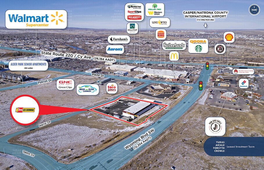 High-visibility location near the signalized four-way intersection of Wyoming Boulevard Southwest and Plaza Drive, providing excellent access and exposure. The lease is corporately guaranteed by LS Group Parent OpCo, LLC, enhancing credit strength. The five-mile radius serves a population of 60,017, with average annual household income of $97,588 within one mile. The property benefits from proximity to State Route 220, which provides direct access to Downtown Casper and carries traffic counts of approximately 26,189 AADT. The absolute NNN ground lease structure transfers all maintenance and expense responsibilities to the tenant, including roof, structure, and parking lot. Projected population and income growth within the 1-, 3-, and 5-mile trade areas support long-term demand in the Casper MSA.