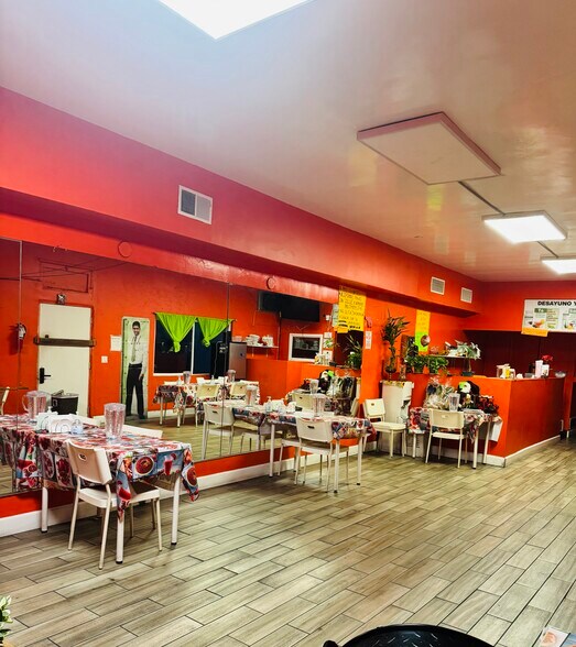 Step into this vibrant and spacious property, ideal for a restaurant, café, or multipurpose business. The interior features bold, eye-catching walls complemented by sleek wood-look tile flooring, creating a warm and inviting atmosphere. Large mirrors along one wall enhance the sense of space and light, while modern overhead lighting ensures excellent visibility throughout. The layout includes multiple dining areas with colorful table settings, perfect for hosting guests or adapting to your business needs. Decorative plants and accents add charm and character to the space. The exterior offers a clean, professional look with ample parking, including designated accessible spaces. Prominent signage opportunities are available to attract passing traffic, and the property is conveniently located near shopping centers and major roads, ensuring high visibility and easy access.