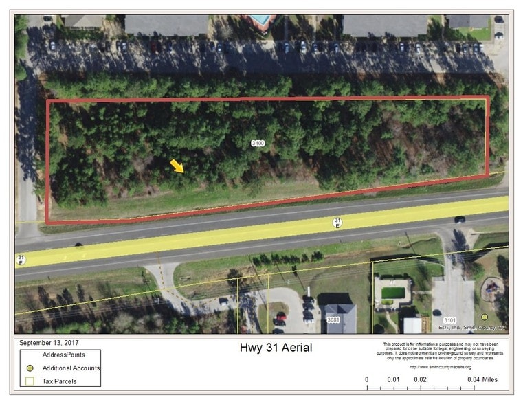 Propriété de la zone Opportunity située à côté du plus récent supercentre Walmart de Tyler sur la route 31 E (artère Major Tyler), cette parcelle a environ 763 pi de façade du côté nord de la route 31. Tous les services publics municipaux sont disponibles sur la parcelle et le zonage C-2 permet la plupart des utilisations commerciales. Il n'existe aucune restriction en matière d'acte ou ECR. Situé du côté est de Tyler, à environ 1 800 pi à l'est de l'intersection de la route 31 et de la boucle 323 et à environ 1 000 pi de l'entrée Walmart. Zone d'opportunité.