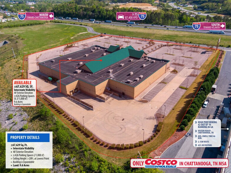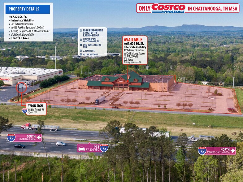 PRIME REGIONAL RETAIL DESTINATION WITH A STRONG CUSTOMER BASE - Prime location in GROWING retail corridor - ONLY CostCo in Chattanooga, TN. MSA Excellent visibility and access to I-75 (87,400)vehicles per day. 2.1 Million Shoppers VISIT COSTCO Per Year. Population of over 288,330 within a ten-mile radius, providing a large customer base in the surrounding area Extremely high Daytime Employment 185,250 Employees in a 10 Mile Radius New Construction and Building Design Completed in Early 2015 Surrounded by 10+ National Brands Including Costco, Circle K, Marathon, Shell, Chick-fil-A, Hampton Inn, Bass Pro, Top Golf, and More; Close Proximity to Factory Plants for Shaw Industries, Container Service Corporation, and Propex Positioned Directly Off of Intersate I-75 Directly North With Traffic Counts Exceeding 87,400 VPD; I-75 Travels North and South from the Canadian Border to the Southern Tip of Florida Only 15 Miles Southeast of Chattanooga, TN (Population 180K) and 25 MilesSouthwest of Cleveland, TN (Population 44K)