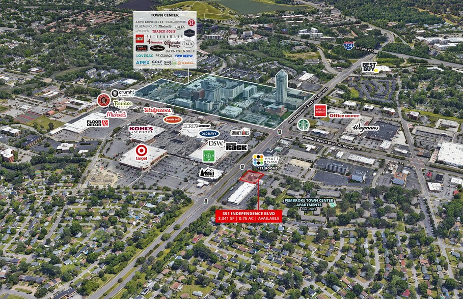 Prime 3,341 SF former bank branch on 0.75 acres with multiple drive-thru lanes, offering excellent frontage, visibility, and signage along Independence Boulevard. The property is strategically located at the signalized intersection of Independence Blvd and Broad Street (±59,200 VPD) in the heart of Town Center/Pembroke submarket of Virginia Beach. Surrounded by upscale retail, office towers, hotels, luxury multifamily, and entertainment destinations, this site sits within one of the most active, high-demand commercial corridors in Hampton Roads.