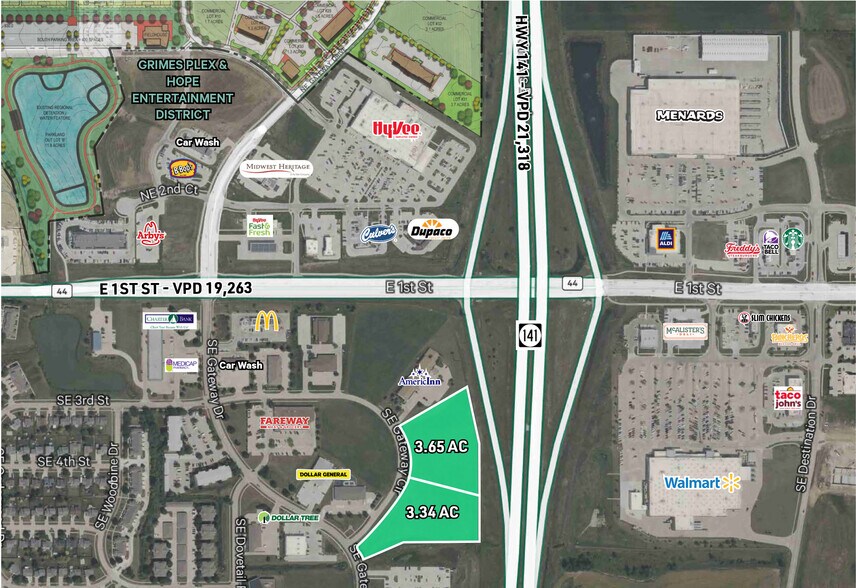 - Les aménagements avoisinants comprennent Fareway, McDonald's, Dollar General, Dollar Tree, AmericInn by Wyndam, Grimes Pediatric Dentistry et d'autres.