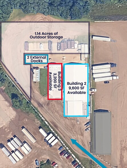 • Storage building; not heated • 14’ clear • 3 phase/1,200 amps; separately metered & paid by tenant • Option for outdoor vehicle, semi trucks/trailers, inventory, and equipment storage in fenced area • Limited light vehicle maintenance only
