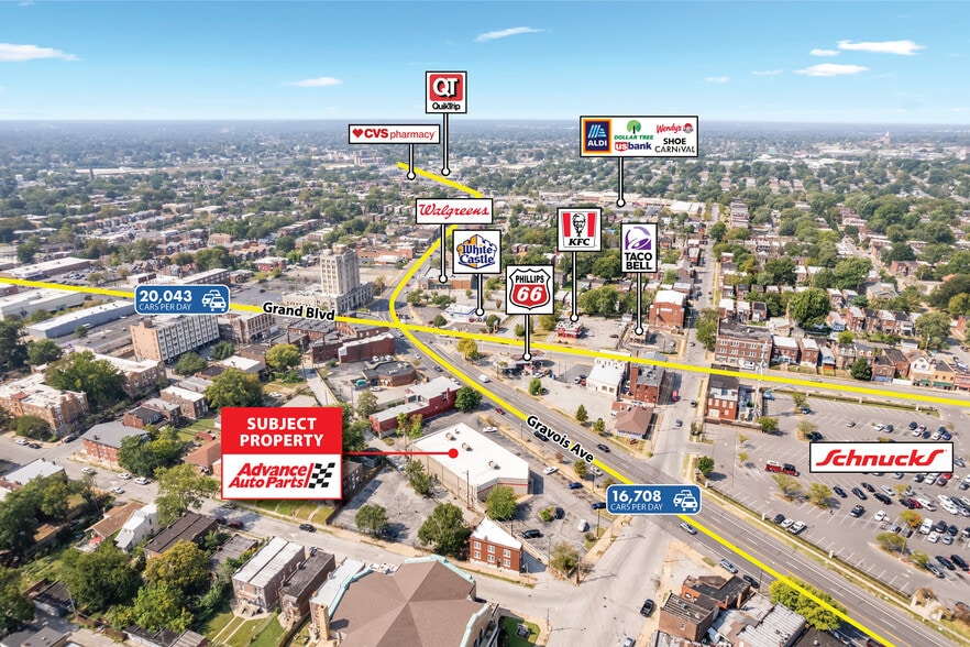 - Prime Signalized Intersection – Located at the intersection of Gravois Avenue (17,000+ VPD) and South Grand Boulevard (16,000+ VPD), providing excepti