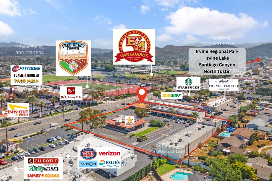 • Free-Standing Restaurant Building • Prime Frontage with Strong daily Traffic counts • High Visibility and Excellent Signage Opportunity • Functional Restaurant Layout - former Sports Grill & Bar • Located at the Orange/Tustin border – Great for Regional Exposure • Strong surrounding Demographics with High Household Incomes • Across from El Modena High School & ±7 minutes to Chapman University • Easy access to 55, 22, I-5 Freeways • Ample Parking and a Well-Maintained Plaza • Surrounded by Long-Established, Successful Businesses • Ideal use: Restaurant / Breakfast / Brunch / Bar / Sports Bar / KBBQ / Korean BBQ / Cafe / Coffee Shop / Dessert Concept / Lounge or Entertainment Concept / Any Restaurant Concept • CALL / TEXT: Tony 909-630-8089 Tiffany 909-273-1994