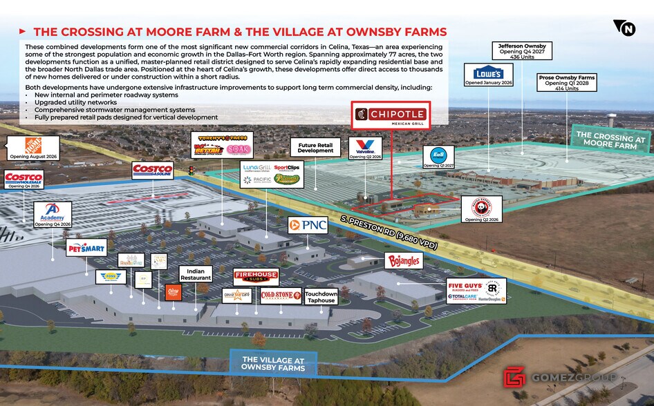 Chipotle is a brand new 2026 construction single-tenant investment opportunity at The Crossing at Moore Farm—a premier mixed-use destination positioned at the gateway to one of the fastest growing cities in North Texas. The tenant occupies 1.10 acres and is projected to open in Q4 2026. The building will feature a “Chipotlane” digital pickup lane, a high-demand format that continues to outperform in fast-growing suburban markets. The Crossing at Moore Farm and The Village at Ownsby Farms together form a unified +77-acre master-planned retail district anchored by Lowe’s and EOS, with Home Depot, Costco, Costco Gasoline and Academy Sports. The property sits immediately adjacent to Jefferson Ownsby and Prose Ownsby Farms—two new Class A multifamily communities totaling 850-units, which will serve as the residential anchor for the district, creating a cohesive mixed-use region that will blend commerce with modern living. The offering includes a 10-year Absolute NNN lease with four 5-year renewal options, providing up to 30 years of potential tenancy.