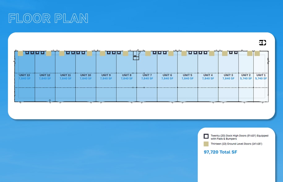 • 97,720 Total SF • Divisible to 7,840 SF or 5,740 SF • Twenty (20) (9’x10’) dock doors equipped with pads and bumpers • Thirteen (13) (14’x16’) ground level doors • 28’ Clear Height • 140’ building depth • 480/277V / 3,000 amp / 3-Phase Power • 186 parking spaces • 43 total trailer parking stalls • 136’ truck court • 6” reinforced concrete slab with 4,000 PSI • ESFR fire suppression • Clerestory Windows throughout • Easy access to I.15