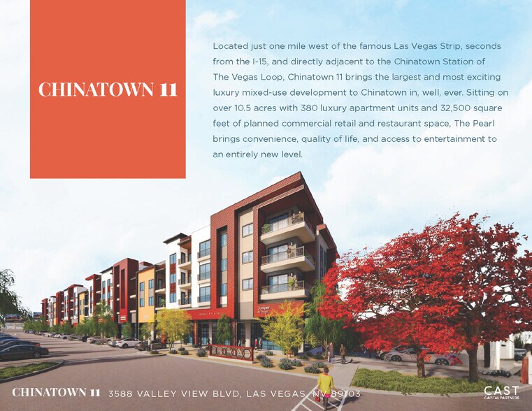 Located just one mile west of the famous Las Vegas Strip, seconds from the I-15, and directly adjacent to the Chinatown Station of The Vegas Loop, Chinatown 11 brings the largest and most exciting luxury mixed-use development to Chinatown in, well, ever. Sitting on over 10.5 acres with 380 luxury apartment units and 32,500 square feet of planned commercial retail and restaurant space, The Pearl brings convenience, quality of life, and access to entertainment to an entirely new level.