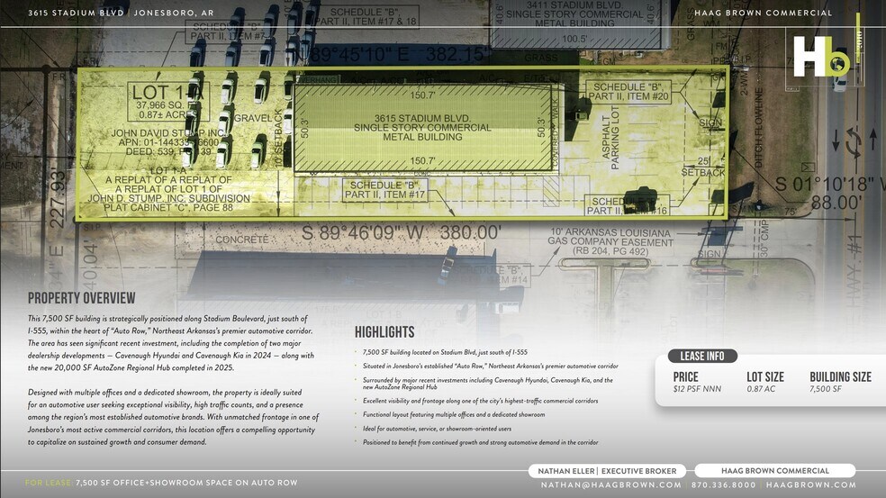 This 7,500 SF building is strategically positioned along Stadium Boulevard, just south of I-555, within the heart of "Auto Row," Northeast Arkansas's premier automotive corridor. The area has seen significant recent investment, including the completion of two major dealership developments - Cavenaugh Hyundai and Cavenaugh Kia in 2024 - along with the new 20,000 SF AutoZone Regional Hub completed in 2025. Designed with multiple offices and a dedicated showroom, the property is ideally situated for an automotive user seeking exceptional visibility, high traffic counts, and a presence among the region's most established automotive brands. With unmatched frontage in one of Jonesboro's most active commercial corridors, this location offers a compelling opportunity to capitalize on sustained growth and consumer demand.