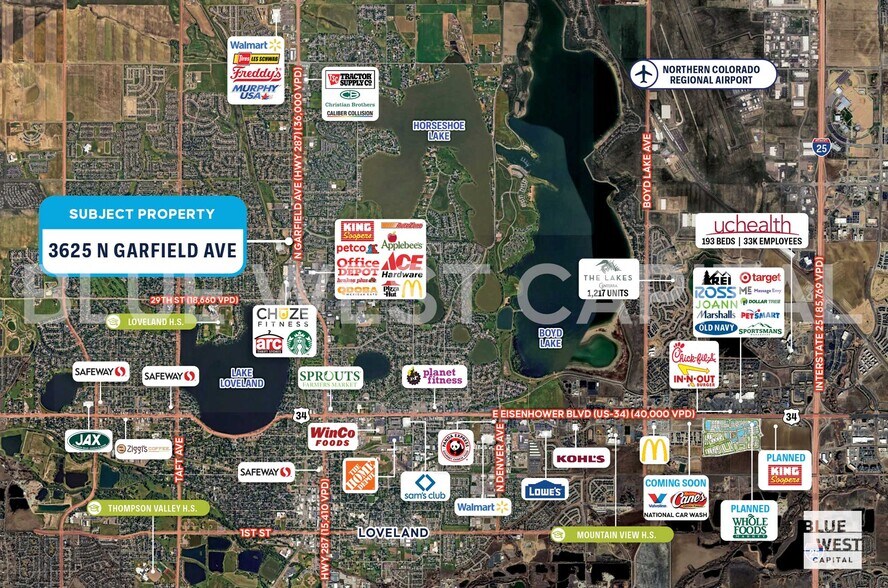 Blue West Capital is pleased to present 3625 N Garfield Avenue, a 0.80 acre pad site along N Garfield Ave. (US-287) in Loveland, CO. Located just north of The Orchards Shopping Center, which draws 2.9 million annual visitors, and adjacent to the new City of Loveland Transit Center, the site captures both strong vehicle and consistent daily foot traffic. With exposure to more than 36,000 vehicles per day and near established national retailers, this property offers a premier location for high-visibility retail or service-oriented development.