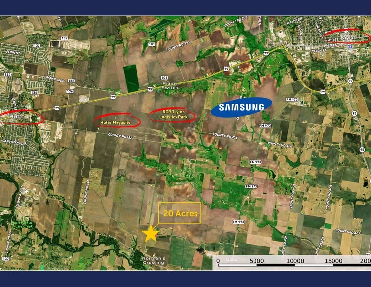 Exceptional 20.62-acre unrestricted parcel, perfectly positioned nearly equidistant from Hutto and Taylor, only 5 miles from Samsung’s Semiconductor Plant. Located 6 miles south of RCR Logistics Park (and on the same road) and 4 miles south of Hutto Megasite, this level lot offers excellent access to HWY 79, FM 973, and the 130/95 toll road interchange. No FEMA floodplain. Ideal for commercial, industrial, and residential development in the thriving Hutto ISD. A prime opportunity!