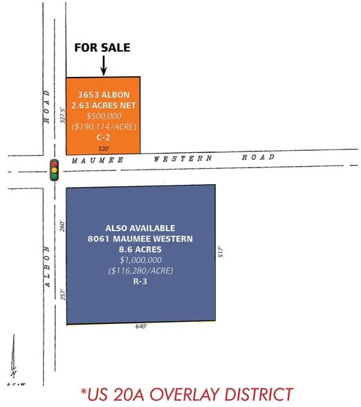 Deux acres à l'angle nord-est du chemin Maumee-Western et du chemin Albon. La propriété a tous les services publics pour le développement et est zonée à des fins commerciales avec le canton de Monclova. Un nouvel échangeur avec l'I-475/23 et Maumee-Western (alias US 20A) est en construction avec l'ouverture de l'été 24. Les nouveaux mises en chantier de logements se poursuivent dans ce corridor résidentiel haut de gamme en croissance rapide.