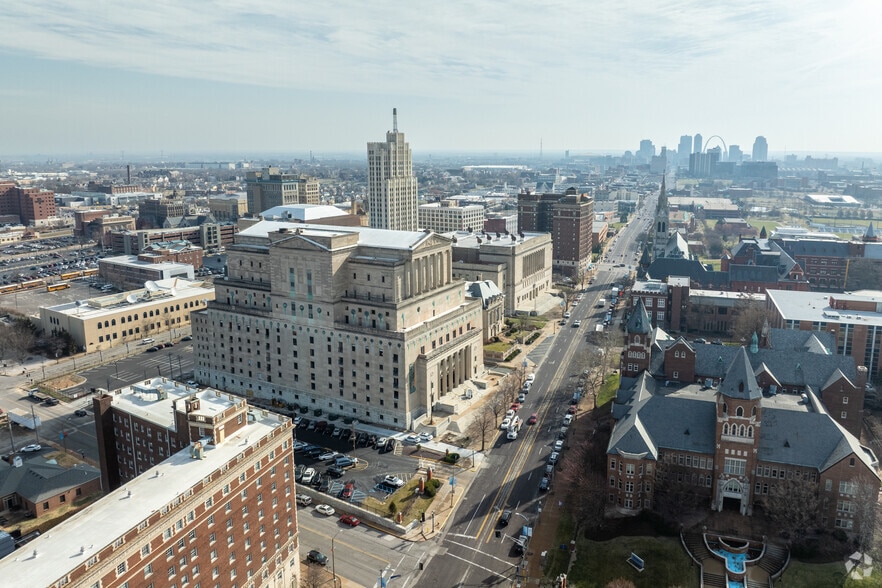 The iconic New Masonic Temple building, offering stunning skyline views. This prime location is next to Saint Louis University and just minutes from downtown. The original, grand main lobby spans two levels and features massive bronze doors, black and white marble flooring, coffered ceilings, and chandeliers. A striking 38-foot mural titled 'The Origins of Freemasonry,' created in 1941 by African American artist Jessie Housley Holliman and dedicated by President Truman, adds a historic touch. Residents enjoy an outdoor-look community space with turf, greenery, and a ping pong table, as well as a fully equipped fitness center with cardio and weightlifting equipment. Additional conveniences include elevators, a free-standing enclosed parking garage, and controlled access. These units offer a wide variety of spacious, open floor plans including multi-level designs. Beautifully appointed with high-end finishes, each unit includes stainless steel appliances, hardwood or wood-style LTV flooring, quartz countertops, cherrywood cabinetry, an undermount sink with gooseneck faucet, wood-look interior walls with box trim molding, European-style tilt-in windows, six-panel doors, modern lighting, plush bedroom carpeting, lighted ceiling fans, and custom blinds. The modern kitchen is equipped with an electric stove, refrigerator, dishwasher, built-in microwave, double basin sink, kitchen island or breakfast bar, dining area, and plenty of cabinet and counter space. Bathrooms feature full-size jetted tubs with shower combinations or walk-in showers with tiled surrounds and flooring. Additional features include high ceilings, large closets, and in-unit washer and dryer. Select units feature private patios, balconies, or terraces with sliding glass doors, walk-in closets, powder rooms, double sink vanities, an office or den, and oversized windows. All units are equipped with air conditioning, heating, and high-speed internet access.