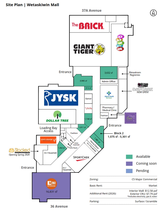 Joignez-vous à The Brick, Sport Chek, Tigre Géant, Pet Valu, Banque Scotia, Dollar Tree, Warehouse One et d'autres détaillants de renom dans le principal centre commercial intérieur de Wetaskiwin. Des opportunités extérieures et intérieures sont actuellement disponibles.