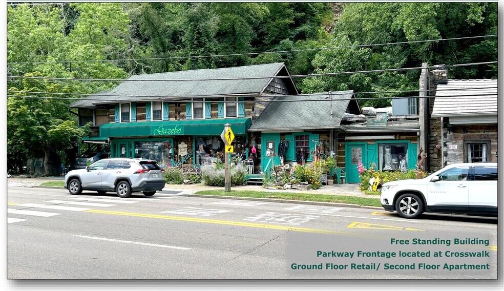 Rare opportunity to own property on the Parkway in Downtown Gatlinburg. Riverfront Free Standing Building being offered "as-is". Ground Floor operating as a Retail Clothing/ Art Gallery Shop with apartment on second level.
