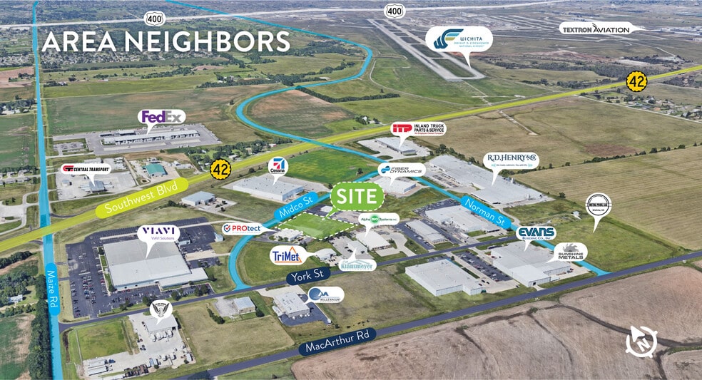 • Situé près du centre aéronautique et industriel du sud-ouest de Wichita • Accès rapide à l'autoroute par K-42, I-235, US-54 • Près de l'aéroport d'Eisenhower • Aucune évaluation spéciale • Services publics à proximité • Parc industriel établi • Mesures incitatives au développement offertes