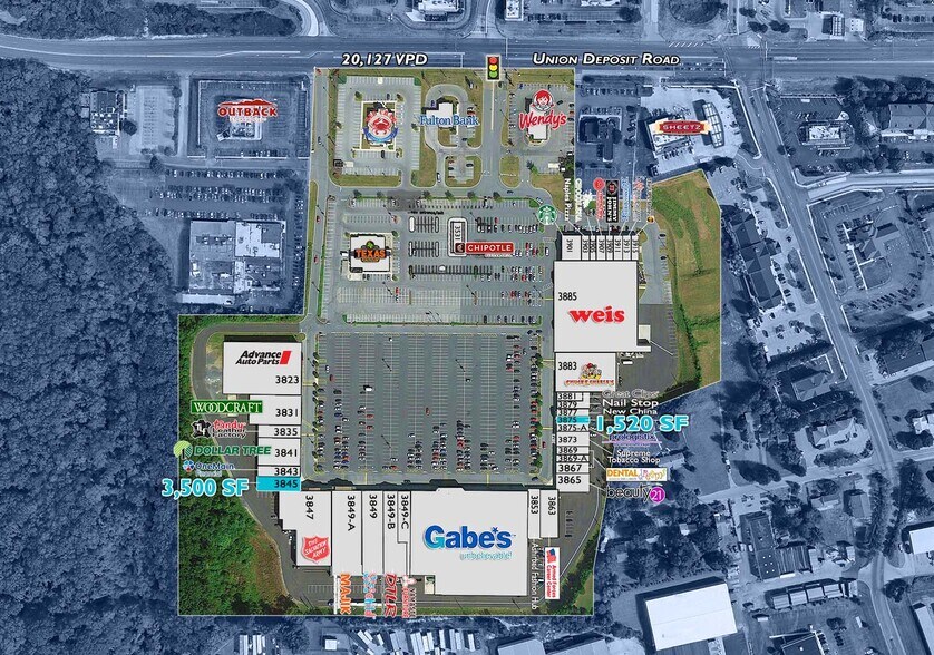 Le centre commercial est ancré par Weis Markets et Gabe's. Les plateformes intérieures comprennent Texas Roadhouse, Chipotle, Wendy's et Fulton Bank. L'agrandissement a une façade le long du chemin Union Deposit. Le centre est idéalement situé à l'intersection de Union Deposit Road et de l'Interstate 83.