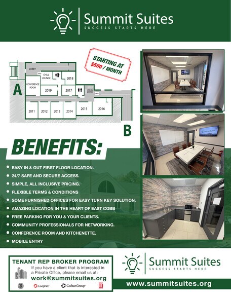 Amazing Co-Working Space with 8 Available Offices and a Shared Conference Room and Kitchenette. * Easy In& Out First Floor Location * 24/7 Safe & Secure Access * Simple All-Inclusive Pricing * Flexible Terms & Conditions * Amazing Location in the heart of East Cobb * Free Parking for you and your clients * Mobile Entry