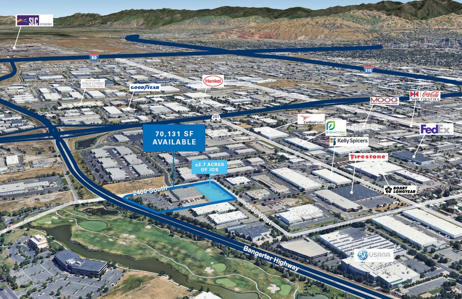FOR SALE OR LEASE Property Highlights – 70,131 total square feet - 27,089 office square feet - 43,042 warehouse square feet – 2.7 acres of potential industrial outdoor storage – Eleven (11) dock high doors equipped with swing on lights, levelers, seals and bumpers – One (1) ground level ramp door (9’x10’) – Radiant heat over docks – Clear height: 26’ – 2,500 amps / 480 /277 / 3-phase power supply – 229 auto parking stalls – Potential for trailer parking stalls – Swamp cooled warehouse – Fully fenced truck court – Gas forced air heat in the warehouse – Column spacing: 32’x32’ – ESFR fire suppression – Concrete tilt construction – Skylights – Florescent and LED lighting – Bangerter Highway frontage – High image corporate office entryway – Excellent access to Highway 201, 2100 South, Bangerter Highway, I-80, I-15 and I-215 – Mass Transit: UTA Bus Stop #513 located on 2400 South – Minutes to Salt Lake City International Airport