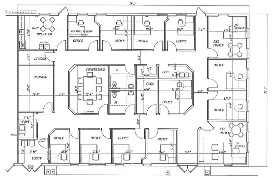 - 389 Commerce = 10,381 SF. Reception, Conference/Training Rooms, 22 Offices, Bullpen, Breakroom, 6 Restrooms. Upstairs est. 500 SF IT/Mechanical Room
